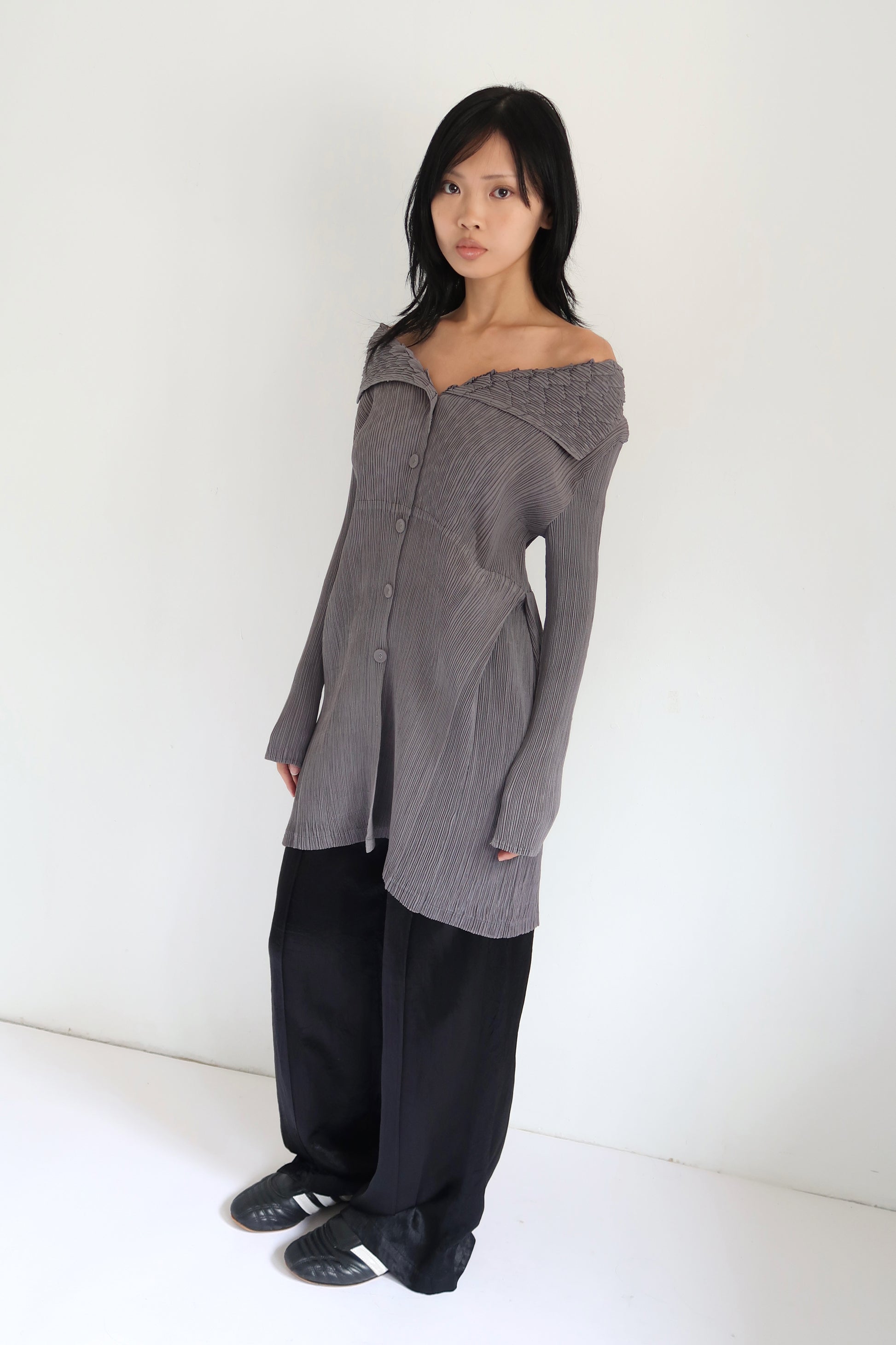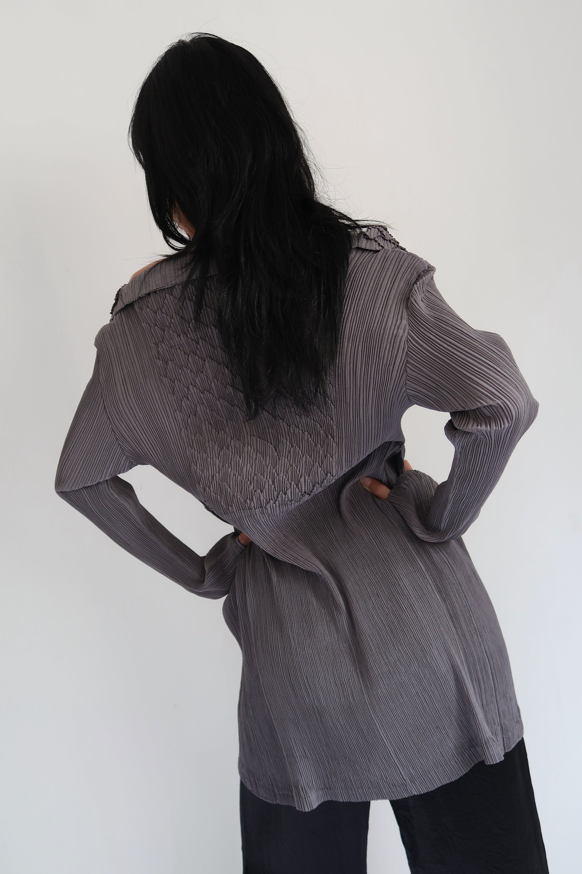 A grey pleated long top by Sasage, a Hong Kong–based brand. Crafted from 100% polyester, featuring a statement oversized collar with button detailing.